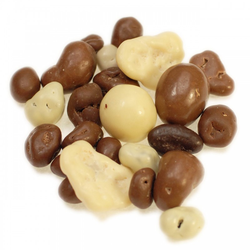 Een mix van verschillende chocolade noten, pinda's, rozijnen en banaan. Gemengd met melk, puur en witte chocola