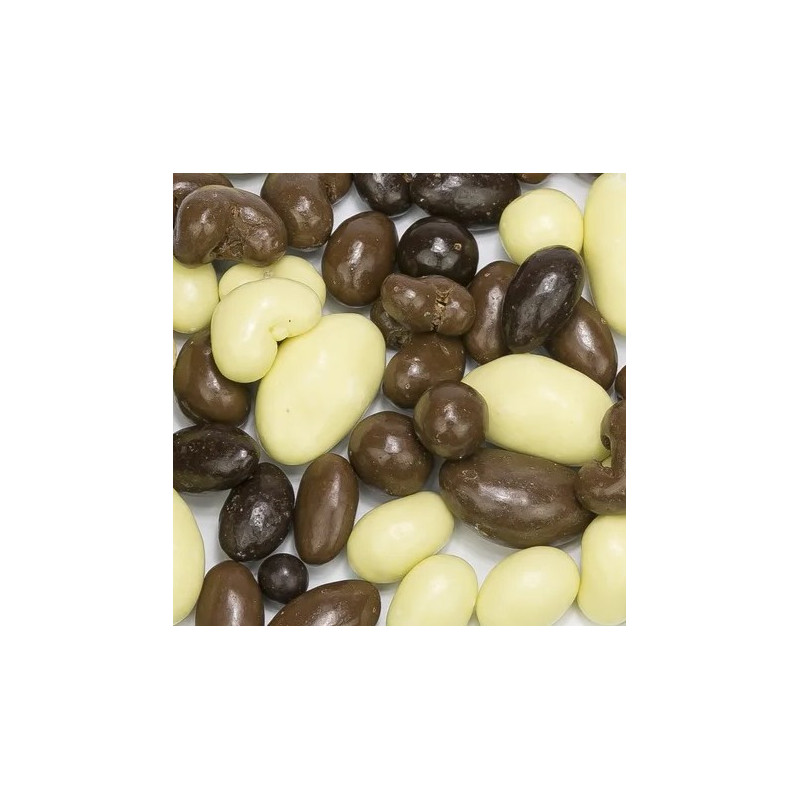 Mix van met chocolade gecoate noten (melk, wit en puur). De mix bevat paranoten, cashewnoten, amandelen en hazelnoten.