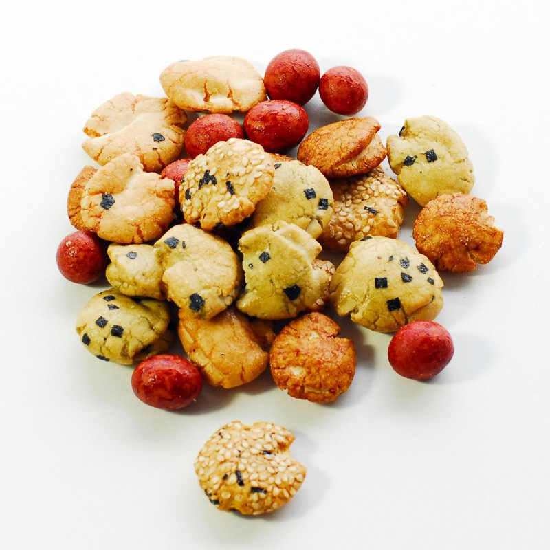PINDA, TARWEbloem, maiszetmeel, Suiker, Maismeel, SESAMzaad, Aardappelzetmeel, Dextrine, SOJA saus (SOJA, TARWE, koji, water, zout), Maïszetmeelsiroop, Zeewier, Rijsmiddel (E500ii), Rijsmiddel (E503ii), Kleurstof (E160c), Kleurstof (E141i), Voedingszuur (E330), Zout, Ui, Kleurstof (E163), Kleurstof (E150a), Knoflook