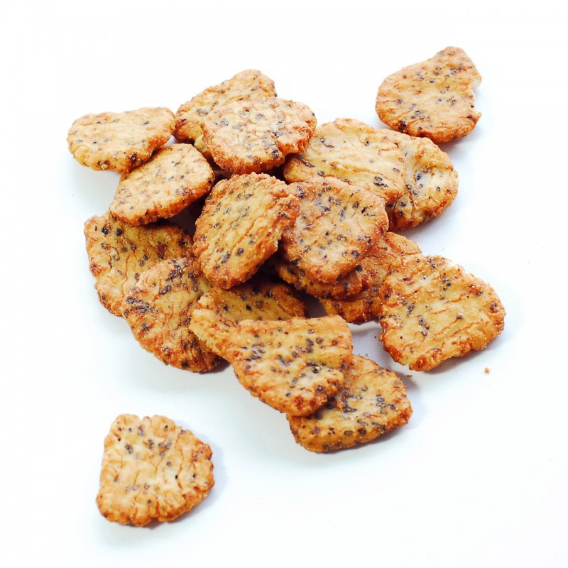 Een zoet-hartige rijstcracker met sesamzaad en sojasaus.