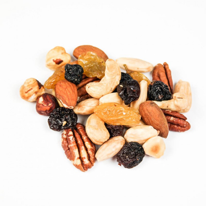 Een krokante mix van geroosterde noten en grote gele en blauwe rozijnen. Versgeroosterde amandelen, macadamia's pecannoten, cashewnoten, hazelnoten en grote rozijnen